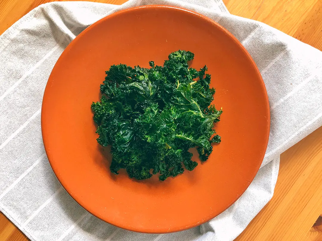 • Heat some oil to about 190°C and fry the drained kale leaves, taking care not to overcook as they can become bitter. Cover the pan while frying, due to the high water content of kale.