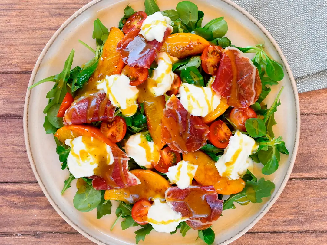 3. Colocamos en un plato una base de canónigos y rúcula, los tomates cherry cortados por la mitad, el melocotón, el jamón y la burrata. Por último, añadimos el aliño por encima y ¡a disfrutar!