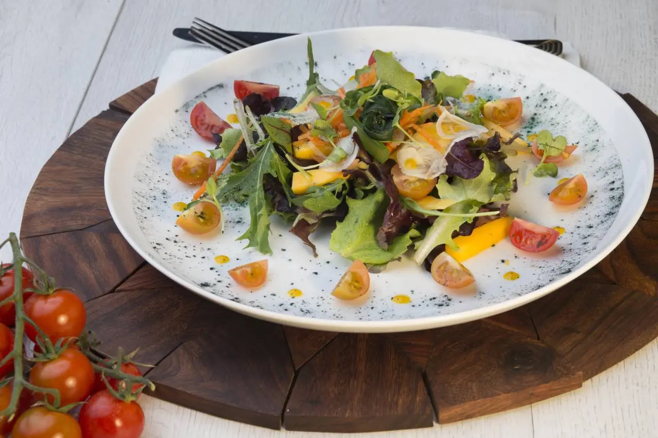 Ensalada de brotes Capriccio, Luxure, duet sensantions con Choi Sum y vinagreta de mango