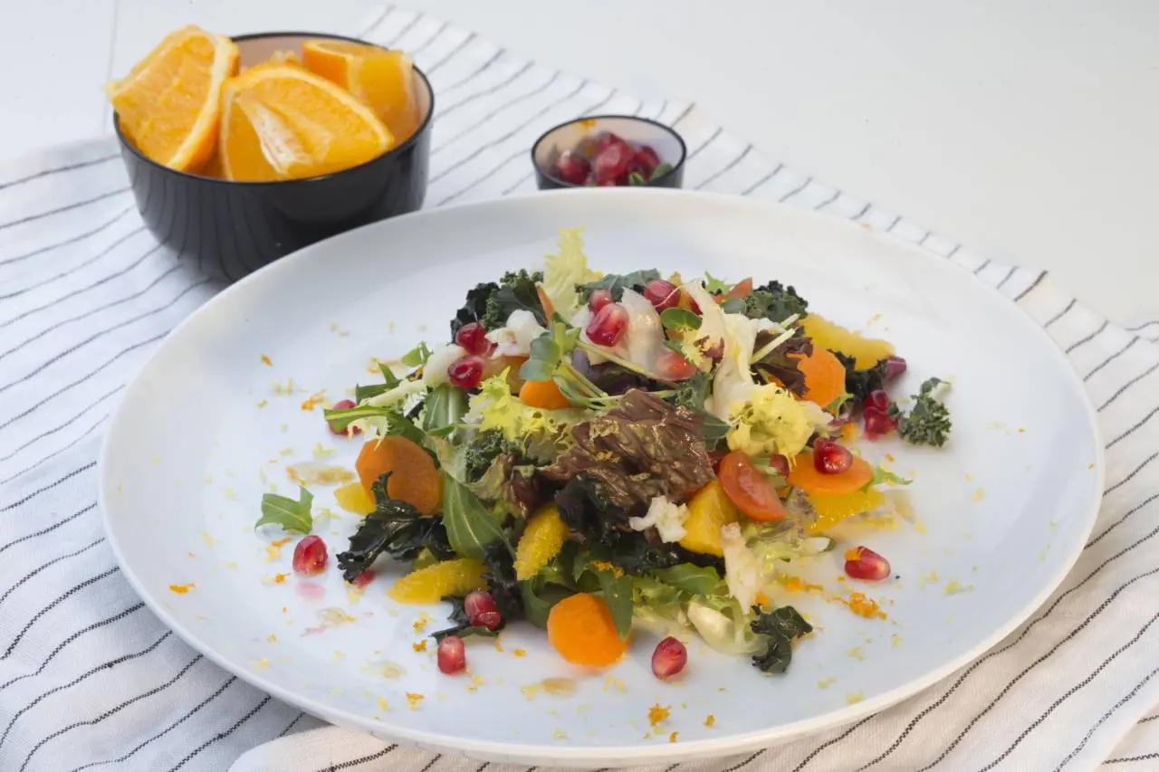Ensalada Mezclum Original con bacalao, naranja, granada y vinagreta de limón