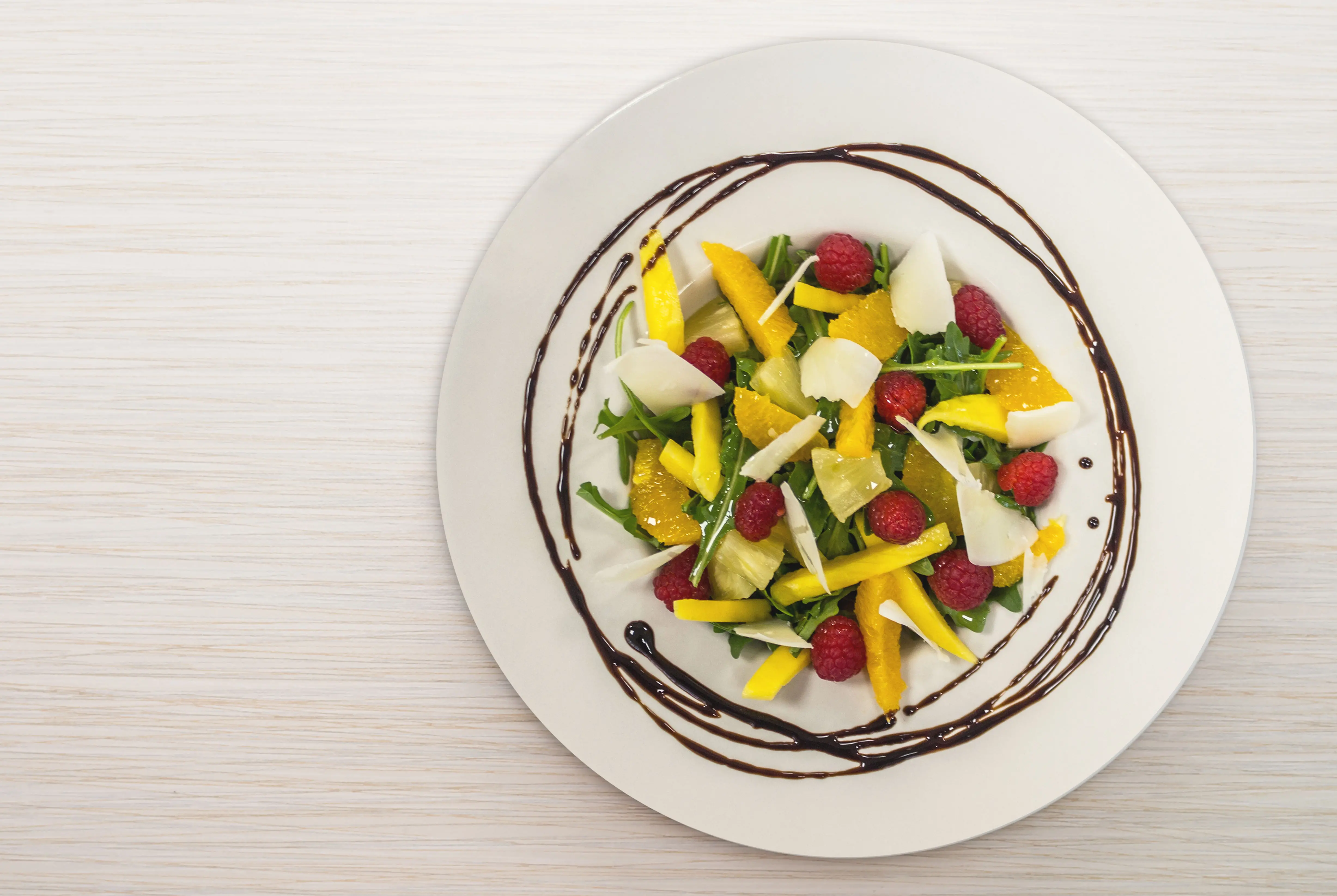 2. En un plato hondo, ponemos como base una porción de rúcula Primaflor y vamos colocando la frambuesa, mango, los trozos de naranja, la piña y por último, las lascas de queso.