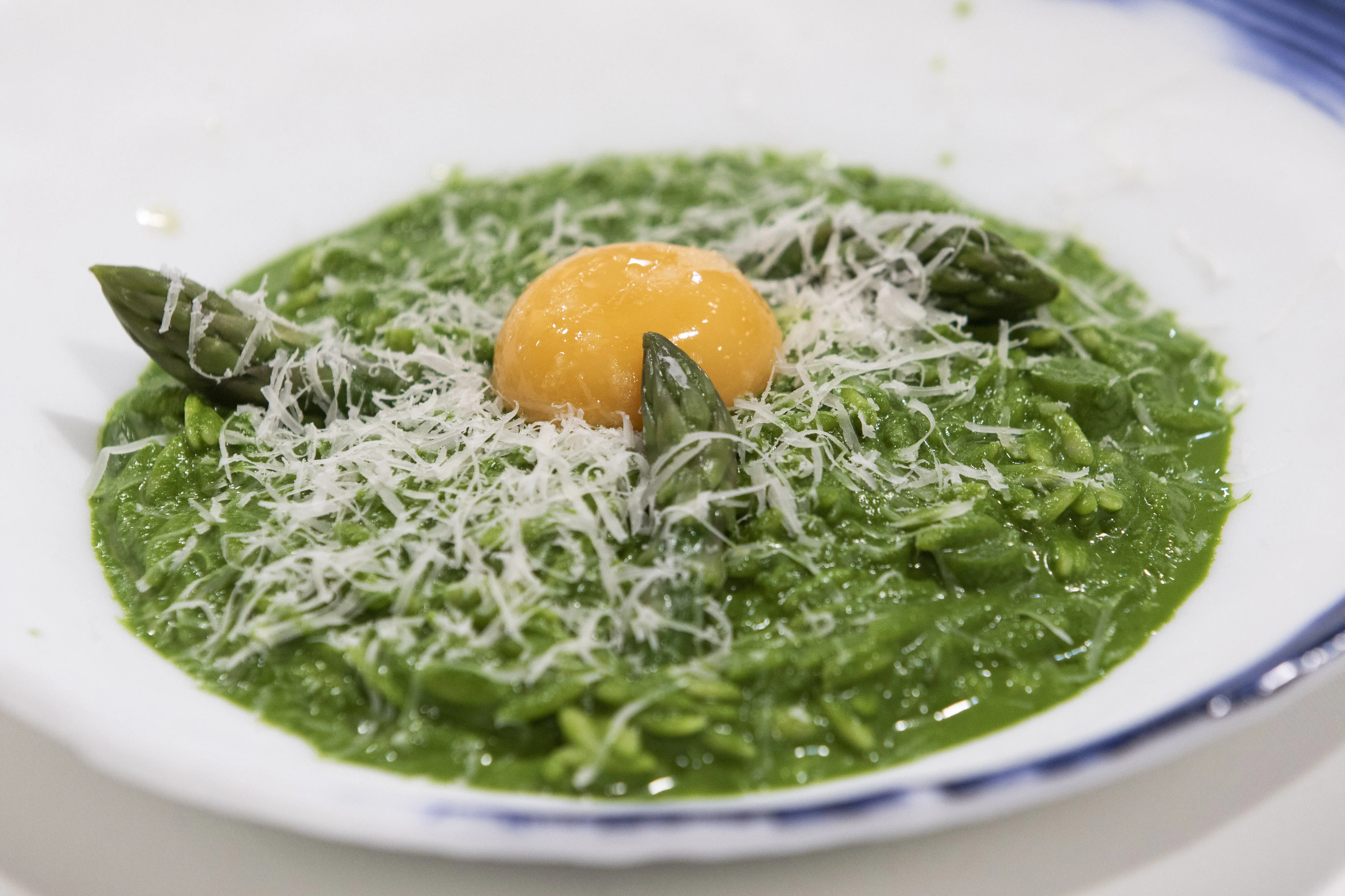 Sin duda, una deliciosa propuesta de Rodrigo de la Calle en la que se une una exquisita crema de espinacas, espárragos y queso, aportando jugosidad y sabor, y un intenso color verde a un falso risotto coronado con el toque original de la yema de huevo curada. El secreto del chef para conseguir ese verde característico es añadir un buen puñado de espinacas justo antes de terminar el plato.
